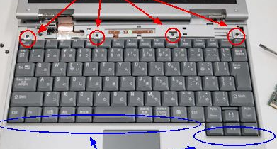 4 schroeven waarmee het toetsen bord vast zit. (zie de rode pijlen) Hierna kan het toetsenbord een beetje naar